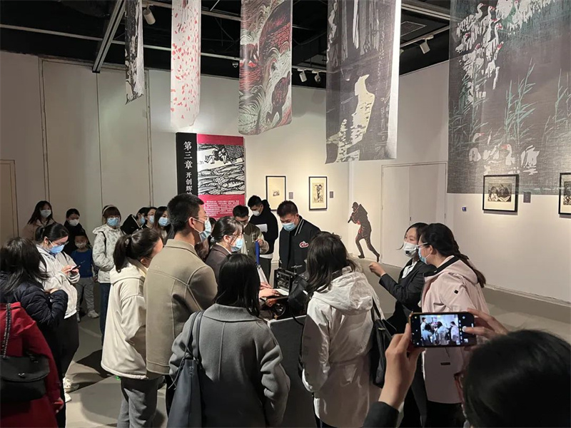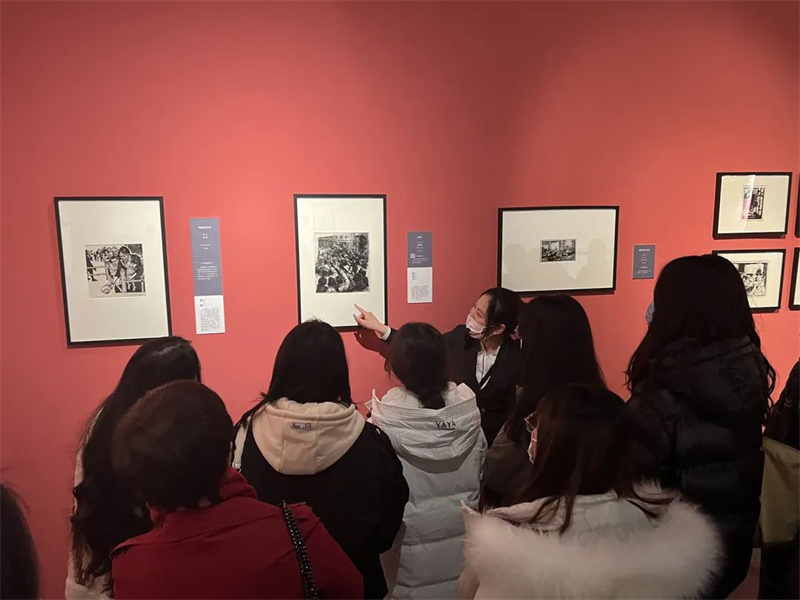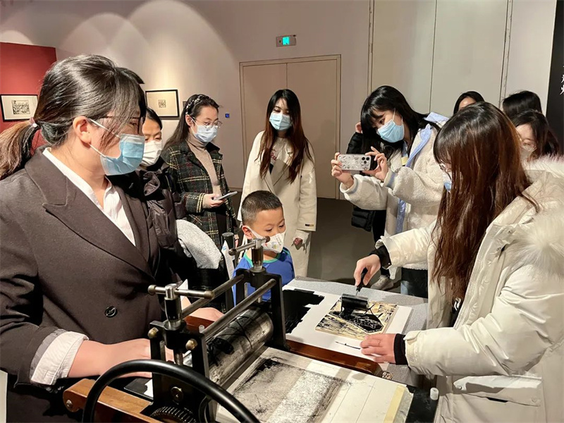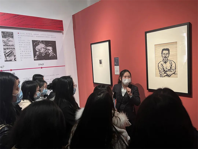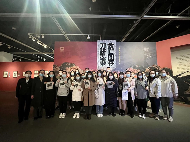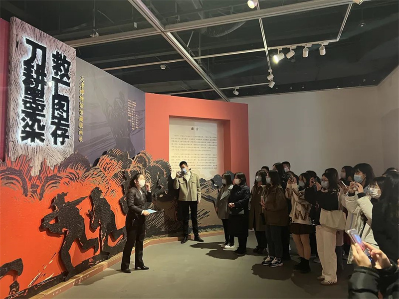 2023年3月17日,天津大学外国语学院的50位师生走进天津美术馆,参观我馆正在展出的“刀耕墨染 救亡图存——天津博物馆馆藏版画展”、参与木刻版画拓印体验活动。