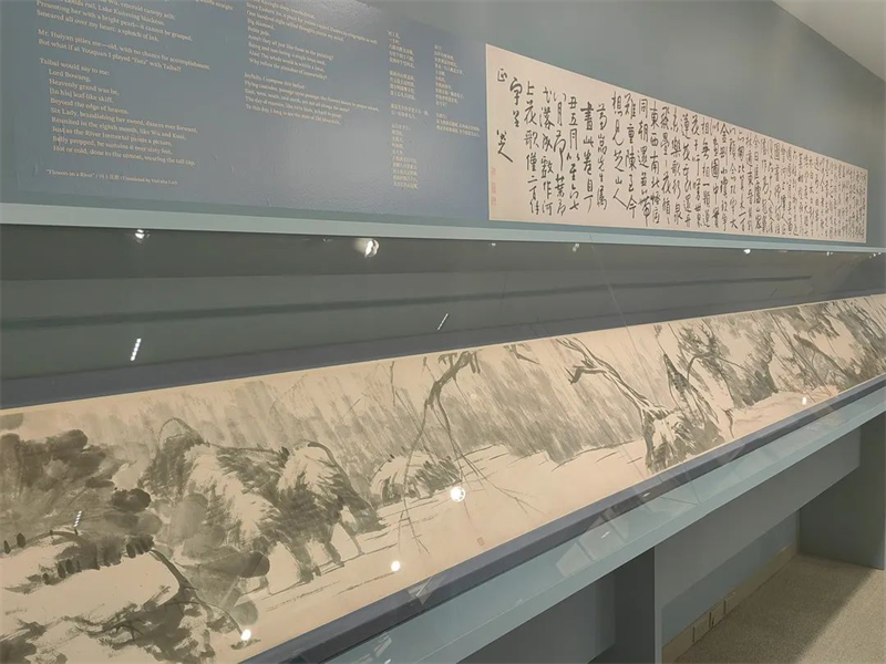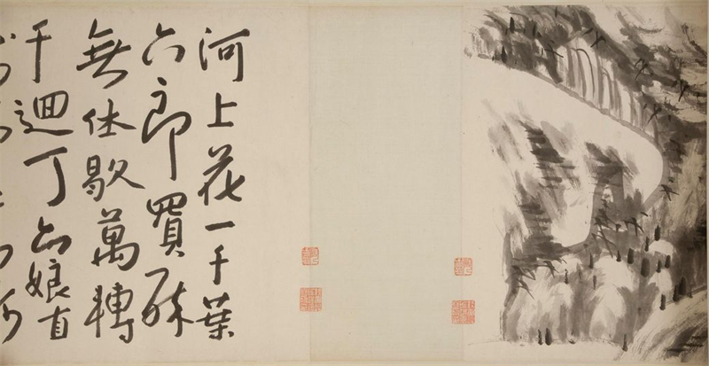 展览题目取自天博重要馆藏文物──八大山人《河上花图》卷,该作品是此次展览的最大亮点。该画作长近13米,画面气势磅礴,跌宕起伏,酣畅淋漓。画家在画面后以行书自题歌行体诗《河上花歌》,情感恣肆、想象丰富,书法流畅老辣,使得全卷作品成为诗、书、画、印俱佳的经典。