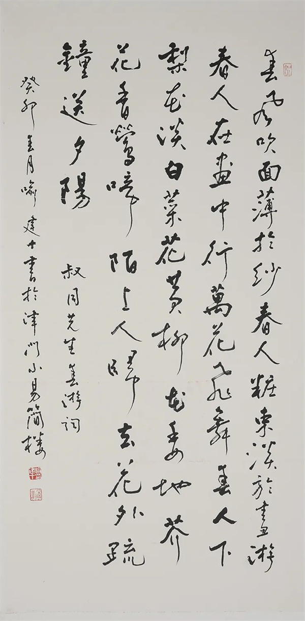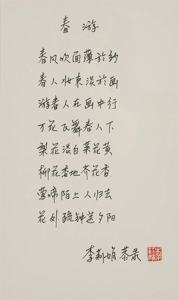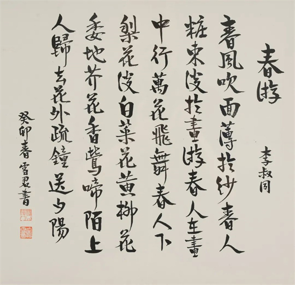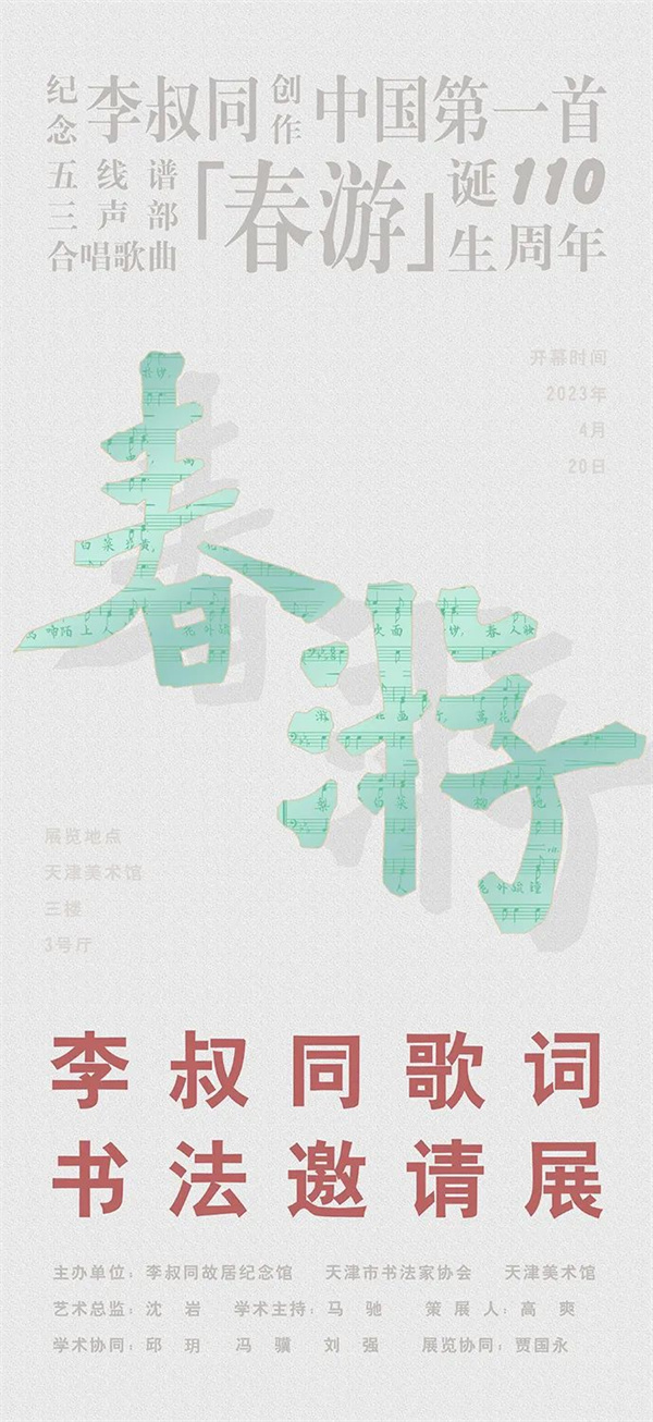 值此春和景明、大地回春之际,李叔同故居纪念馆、天津市书法家协会、天津美术馆特举办“春游——李叔同歌词书法邀请展”。李叔同嫡孙女李莉娟、丰子恺外孙宋雪君等大师后人,张建会、李锋、喻建十、杨健君等书法名家40余人,通过笔墨祝贺《春游》歌曲110周年华诞,同时再现了《忆儿时》《送别》《祖国歌》《我的国》《西湖》等一大批李叔同创作的经典歌词,以恭敬之心向艺术大师致敬。