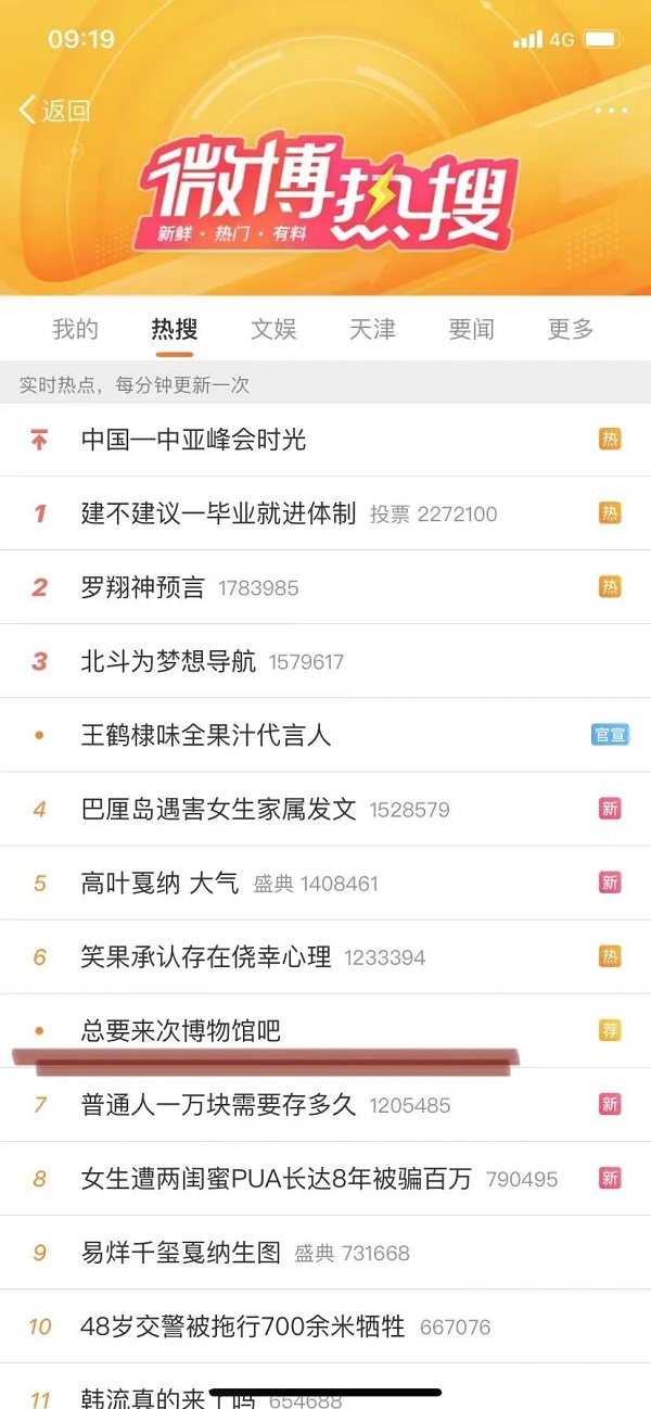 今天是“5·18日——国际博物馆日”,今年国际博物馆日的主题是“博物馆、可持续性与美好生活”,强调博物馆能够创造联动效应,促进积极变化,可以在诸多方面为可持续发展目标、助力美好生活作出贡献。天津博物微博发起话题#总要来次博物馆吧#,一度登上微博热搜排行榜。