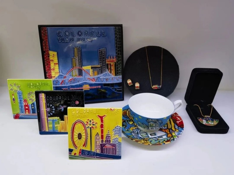 系列产品中包括元宝项链、转珠项链、耳钉、咖啡杯、瓷板画等,搭配在精美的包装盒里,可作馈赠亲友的天津特色“伴手礼”。如果是前来旅游的小伙伴们也可以按照产品上面绘制的地标建筑去游览,进行拍照打卡。