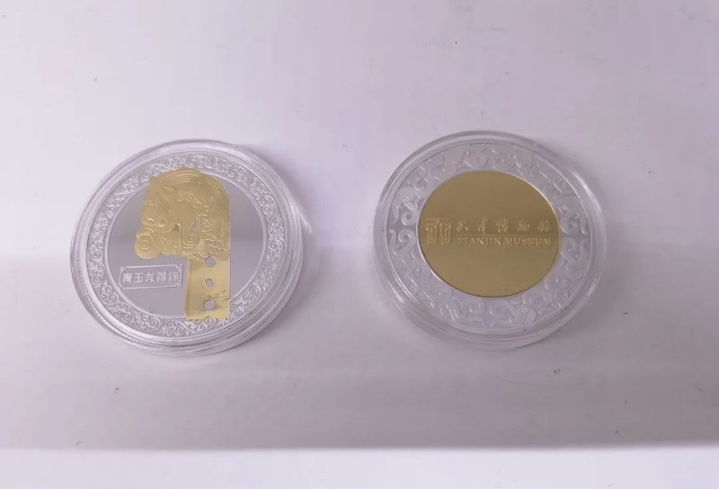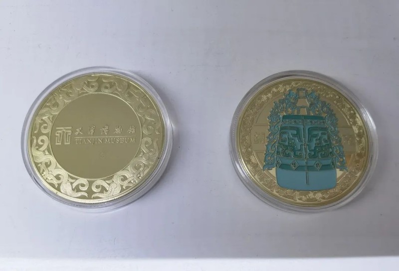 设计师将藏品平面化,突出造型结构与纹饰特点,推出了锌合金材质的金、银纪念币。