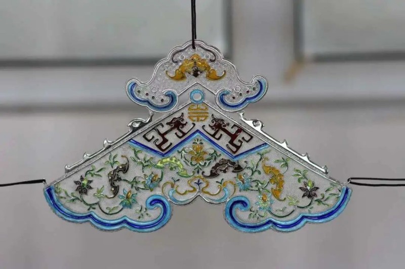 产品原型是天博馆藏文物清代乾隆年制粉彩蝙蝠纹磬。磬与庆谐音,蝙蝠与磬的组合表达的是福磬之意。这件产品的外形高度还原了粉彩蝙蝠纹磬,而材质上则选用白银制作,在制作工艺上是根据津派花丝的八大工艺:掐填攒焊,堆垒编织制作而成的。首先把银条拔成所需要的各种型号的银丝,银丝最细拔到了0.02毫米,然后再用膘好的银丝去掐出各种花型图案,最后是填色,这款产品里包括了八大工艺的全部步骤。