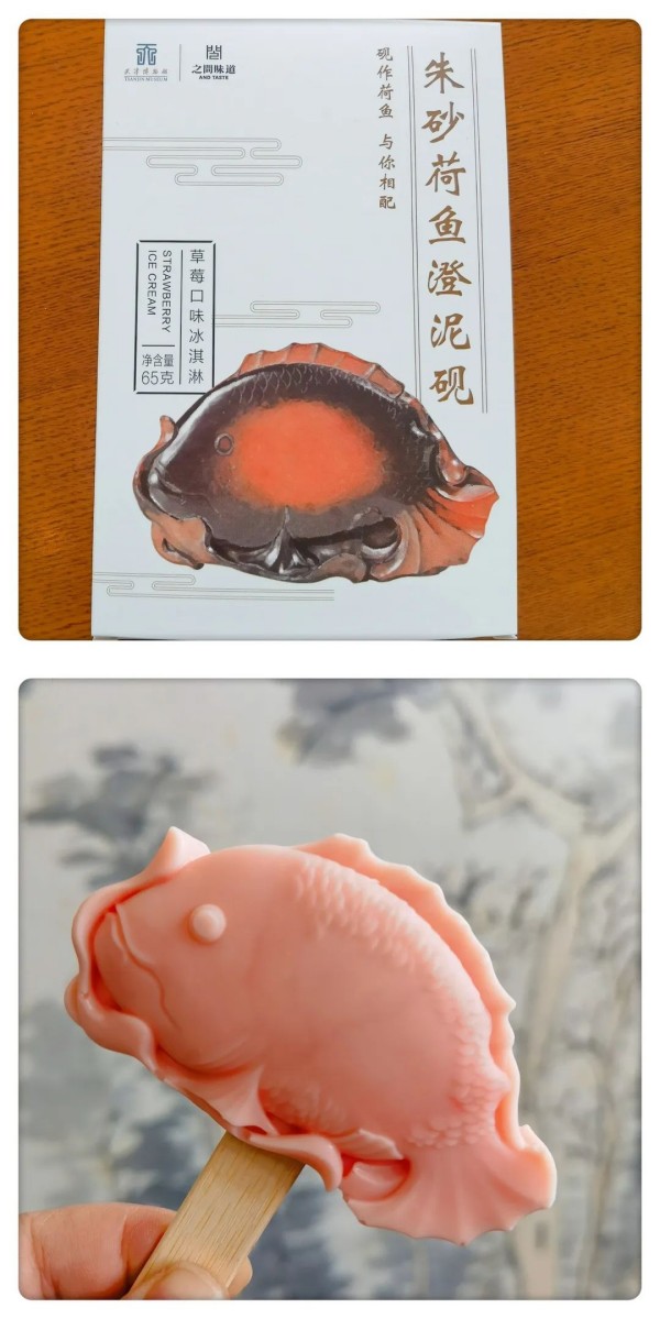 这款产品造型选自馆藏精品文物朱砂荷鱼澄泥砚,砚呈朱红色,泥质优良,色泽鲜艳,砚体雕成鲤鱼侧卧于荷叶上,鱼身为砚堂,鱼鳍、叶边翻卷成砚缘,而尾、鳍之间的凹槽作为砚池,整体造型取意“和和美美,连年有余”,构思十分巧妙。