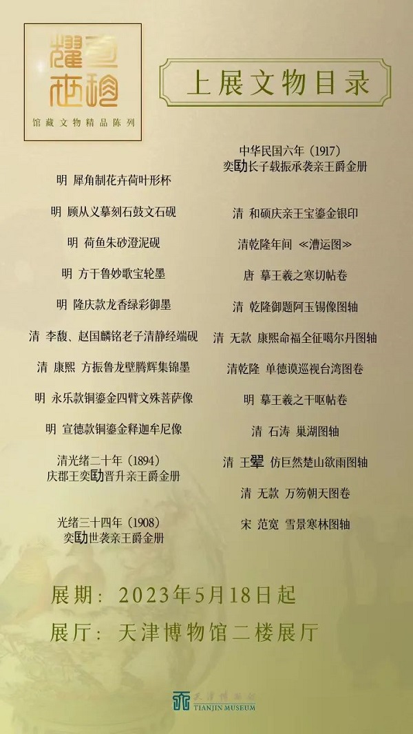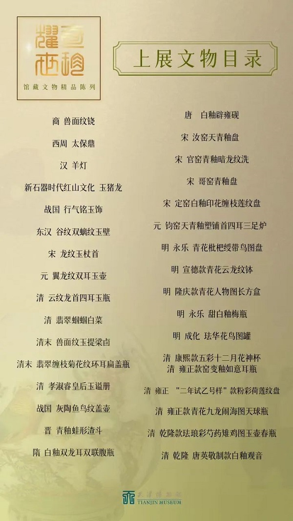 为扎实开展学习贯彻习近平新时代中国特色社会主义思想主题教育,不断满足广大人民群众对高品质精神文化生活的需求,贯彻落实高质量发展“十项行动”,更好地服务广大观众,特公布“耀世奇珍——馆藏文物精品陈列”展品目录。此次全新升级的展览,精准对接观众需求,充分发掘馆藏文物,阐释好文物背后的中华优秀文化内涵。展览精选天津博物馆甲骨、青铜器、玉器、书画、陶瓷器、竹木牙角器、砚台、墨、玺印等各类文物精品百余件,呈现天津博物馆琳琅满目、精品纷呈的丰富馆藏。展品几乎全部为一二级品,其中一级品更是占了绝大多数。全新升级的“耀世奇珍”中囊括的文物种类更多,展出的文物数量更多,更是将近百分之五十的展品为新鲜上展,此前未在精品陈列中进行展示。这些是文物工作者在文物活起来的原则下深入挖掘馆藏资源,经过精心的准备、论证,又挑选出的一批珍贵文物资源。此次展览筹备中着重增加与中华文明起源相关、与大运河相关,以及反映天津历史文化传承的重点文物,让观众在全面了解馆藏的同时,借助文物对中华文明起源、对历史文化传承加深了解。展览注重文物整合,通过小专题讲述文物故事,例如天津博物馆收藏了与奕劻有关的三套金册,以及清和硕庆亲王宝鎏金银印,这些文物自成系列,整体反映了清末至民国初年的爵位承袭制度,有较高历史价值,极为难得,在展览中进行了集中展示。另外此次展览在展示文物实物的基础上,首次展出西周太师鼎、西周克钟、西周大克鼎、战国楚王鼎等拓片,这些新挖掘出来的拓片既是珍贵馆藏,也是文物的重要研究资料。