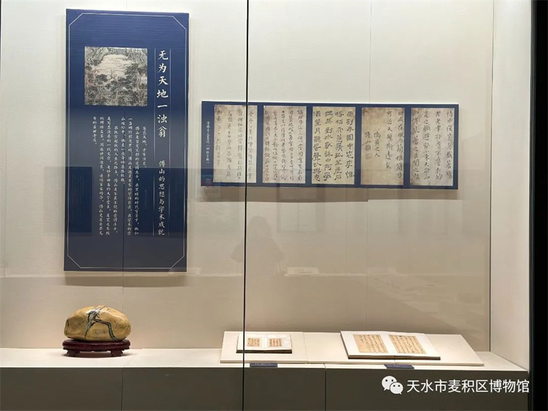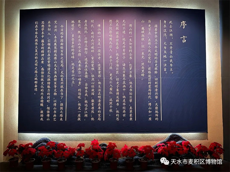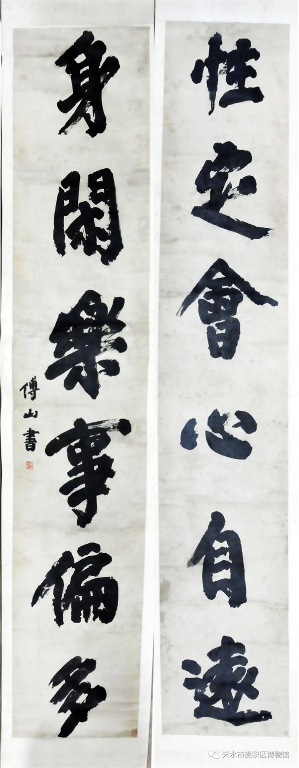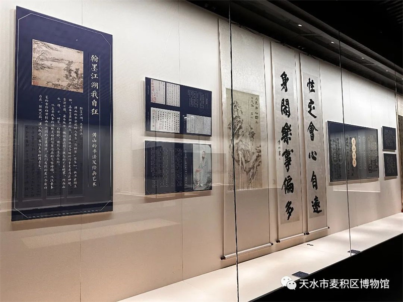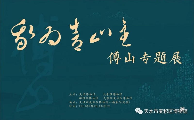 翰墨挥渭水,青山映龙城。为加强馆际交流合作、推动文化资源融合共享、推动文物活化利用、丰富群众文化生活、提升博物馆公共文化服务效能,在第三十二届天水伏羲文化旅游节到来之际,6月8日,由天津博物馆、太原市博物馆、绵阳市博物馆、麦积区博物馆四馆联合举办的《我为青山主——傅山专题展》在麦积区博物馆一楼展厅正式开展,展览为期三个月(2023年6月8日--2023年9月8日),本次展览是麦积区博物馆落实“三抓三促”行动的具体举措,也是我馆“2023年文化和自然遗产日”的重点活动,对丰富群众文化生活、推动馆藏文物活化利用和提升公共文化服务能力具有重要意义。