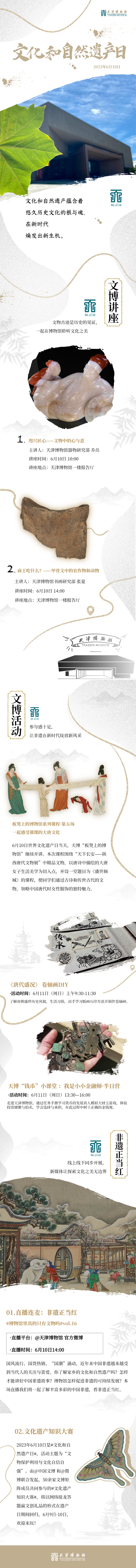 每年6月的第2个星期六,是文化和自然遗产日。今年的文化和自然遗产日是6月10日,主题为:文物保护利用与文化自信自强。为进一步提高人民群众非物质文化遗产保护意识,传承弘扬中华优秀传统文化,营造全社会共同参与非遗保护传承的良好氛围,天津博物馆特举办“文化和自然遗产日”系列活动,欢迎大家走进天博,了解非遗深厚底蕴,感受非遗非凡力量,让非遗薪火相传,展现时代光彩。