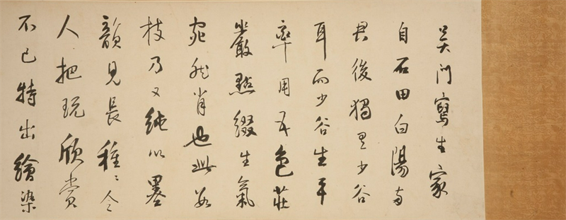 此件作品以缂丝工艺制成,做工精细,色彩清丽,画面生机盎然。作品描绘一处水边的秋日景色,岸上有山石花草,荡着微波的水边植几株荷花,叶边微枯黄,花叶相互掩映,摇曳生姿,荷花上方有两只燕子盘旋欲落,画面上部以渐变的蓝色表现碧空千里。右上角题“御制秋荷诗”,题诗内容为:初日耀朱花,昀烁漾前浦。远香静中闻,水仙欲起舞。净植不染泥,名冠群芳谱。绰有君子风,岂与凡卉伍。凉风满虚亭,万柄难悉数。茂叔雅爱同,赏心达今古。