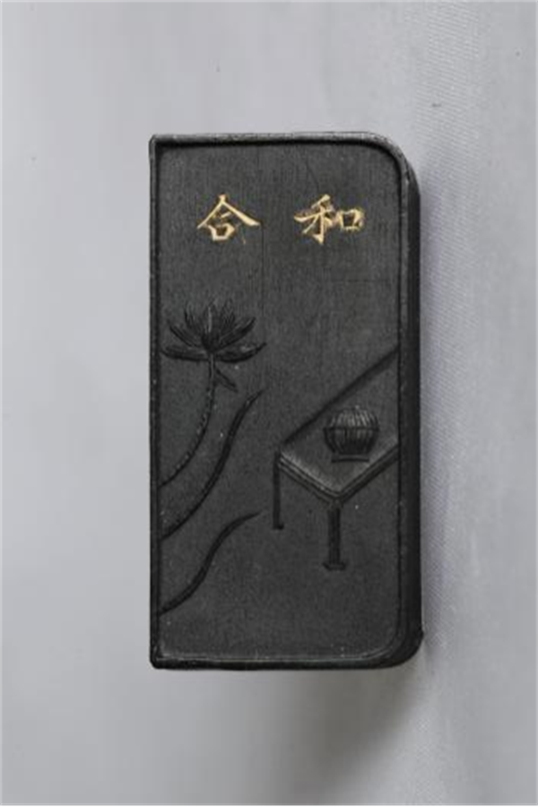 墨作长方形,一面刻“荷”、“盒”图,上有“和合”阴识填金二字,背书“苍佩室造”,寓和谐、美好之意。