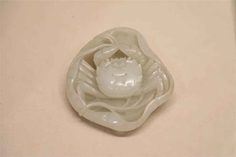 白玉,玉质温润细腻。整器采用镂雕兼阴刻技法。荷叶外缘翻卷内敛,器内荷茎环绕并雕琢一只栩栩如生的螃蟹,憨态可掬,饶有生趣,器底花叶筋脉琢磨流畅细腻,清晰可见。此器景物生动,工艺精湛,可作为文房笔掭、镇纸之用,既有实用性也有观赏性,清新自然之气跃然而出。