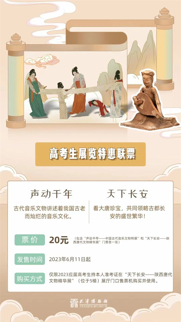 天津博物馆推出【声动千年?天下长安|高考生特惠联票】,仅限2023应届高考生持本人准考证在“天下长安——陕西唐代文物精华展”(位于5楼)展厅门口售票机购买并使用。欢迎高三学子走进天博,开启一场仪式感满满的毕业之旅!