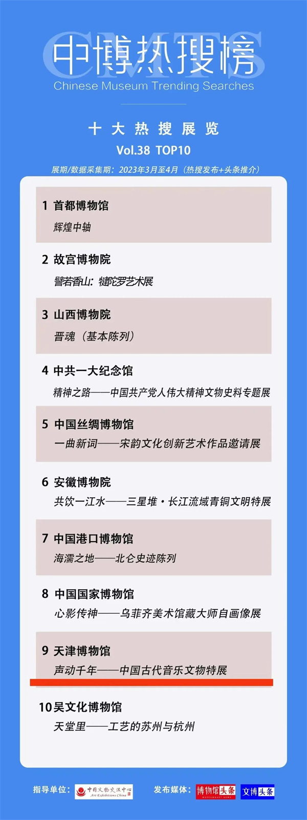 "声动千年——中国古代音乐文物特展"自3月21日开展以来,便引起了社会广泛关注,新华社、央视新闻总台天津总站、中国新闻网、天津电视台、天津日报等媒体记者纷纷采访报道,并荣登3—4月份中博热搜榜榜单。
