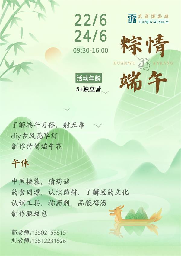 端午节,是集拜神祭祖、祈福辟邪、欢庆娱乐和饮食为一体的民俗大节,也是我国首个入选世界非遗的节日。值此节日来临之际,天津博物馆、天津美术馆和李叔同故居纪念馆联手策划,将围绕传统端午习俗,开展系列文化活动,邀请全国、全市观众朋友们走进博物馆,粽叶飘香五月五,浓情端午共安康。