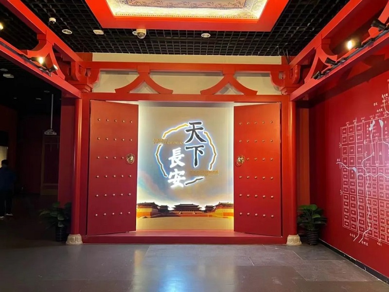 此外,在展厅中还设有两处打卡场景,其中一处为以《长安十二时辰》影视资料等为灵感,并参考西安“大唐不夜城”及其他相关资料设计的唐风景观;另一处为唐代诗词景观,以供观众欣赏拍照。