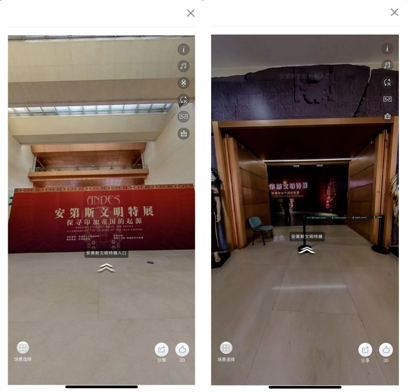 以文化中心外景的航拍VR为进入的首场景,让大家有一种走入博物馆的仪式感。进入馆内,大厅为整个VR的信息中心,利用场馆的左右墙壁,将临时展览和基础展览的海报分别体现在左右,让参观更加方便快捷。