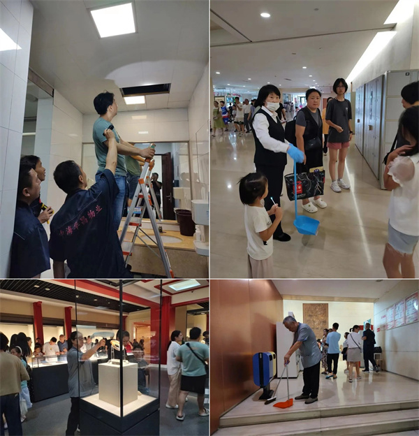 为保证服务态度和服务水平,加大对一线部门,特别是物业公司、保安公司的考核力度,增派人员,全面提升服务观众水平和参观满意度,用心服务观众、用情温暖观众。为了不断提高观众满意度,为了馆内环境卫生,他们经常顾不上吃饭、喝水,在展厅内维护观众秩序,不停擦拭展柜玻璃,耐心细致解答观众的各类问题,提供相关服务等。为更好地服务观众,馆内及时推出延时闭馆措施,确保有序观展。