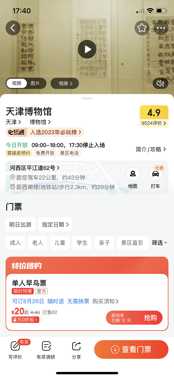 在美团APP上搜索“天津博物馆”将看到对应的优惠票购买通道