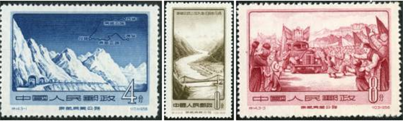 1956年3月30日,中华人民共和国邮电部为了反映中国西藏公路建设的新面貌,发行《康藏、青藏公路》邮票全套3枚
