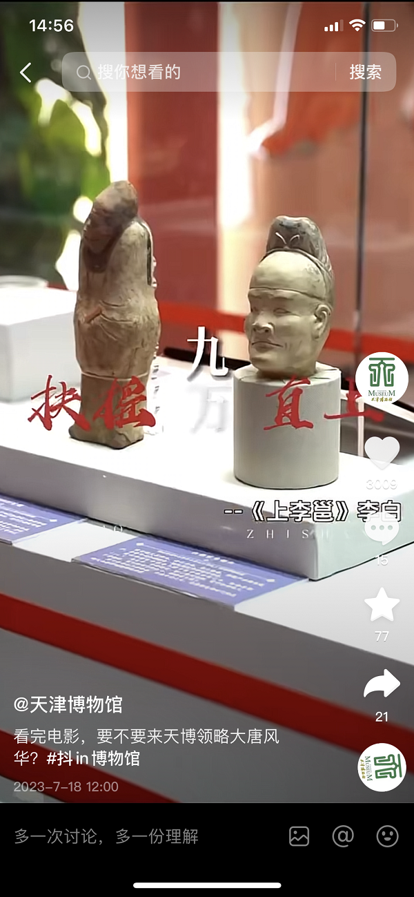 “除了传统媒体宣传之外,我们也在新媒体推广方面不断探索。”李君说,除了利用微博、微信公众号及时介绍天津博物馆的展览信息和馆藏文物的文化背景外,天津博物馆还抓住当下短视频流行的趋势,开通了天津博物馆的抖音账号。“例如最新一期制作的短视频内容,就是结合现在热映的《长安三万里》这部动画电影,介绍了天津博物馆引进的‘天下长安’展中的唐代文物。”
