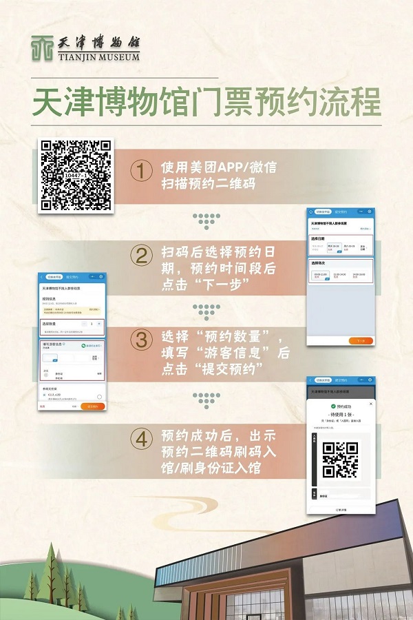 01.天津博物馆向社会公众免费开放,观众可在网上提前七日预约门票。预约成功后,可凭预约码及有效证件,包括本人二代身份证、港澳台居民居住证、天津市第三代社保卡原件刷证入馆。
