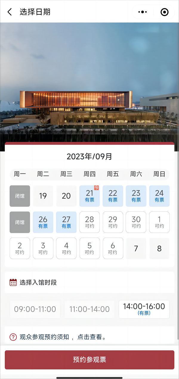 自9月23日0点起,可预约9月29日门票,以此类推,中秋国庆假期期间,提前7天可约每日进馆门票。