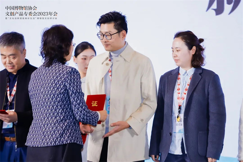 专委会副主任委员、天津博物馆沈岩副馆长宣读2021-2023年度新入会会员单位名单,并颁发证书。会上还发布了由文创专委会委托副主任委员单位陕西历史博物馆设计的十周年纪念徽章数字文创。