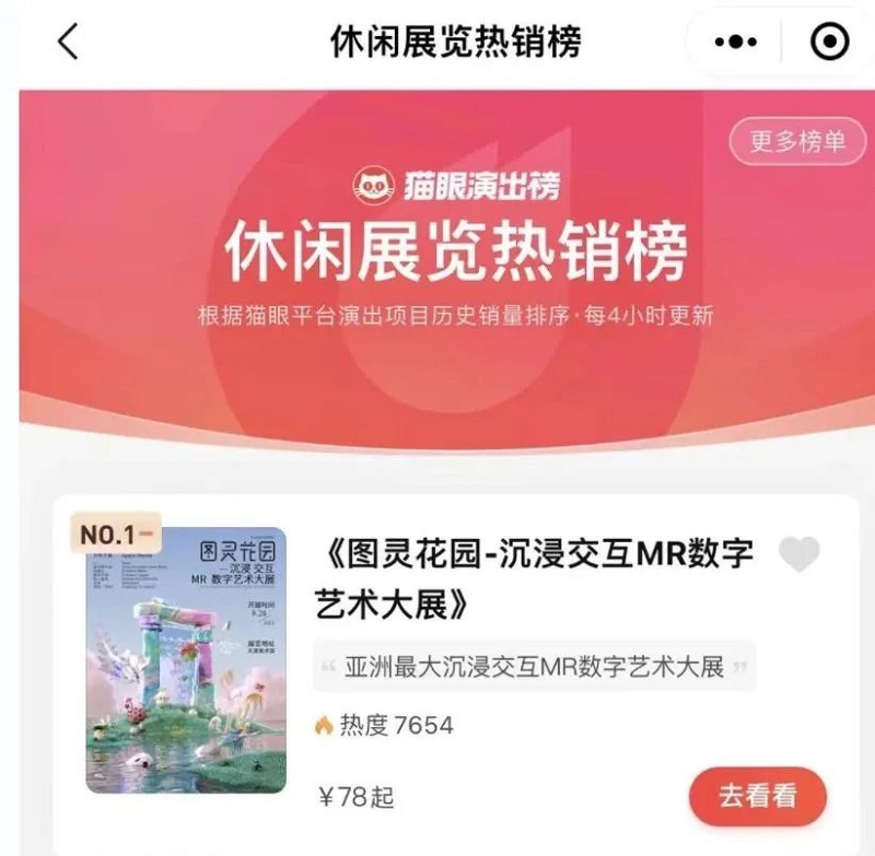 升级后的“图灵花园”在上线第一周便受到了社会各界的广泛关注,更是在“抖音”与“猫眼”平台的展览排行榜均取得了热度第一名的好成绩!