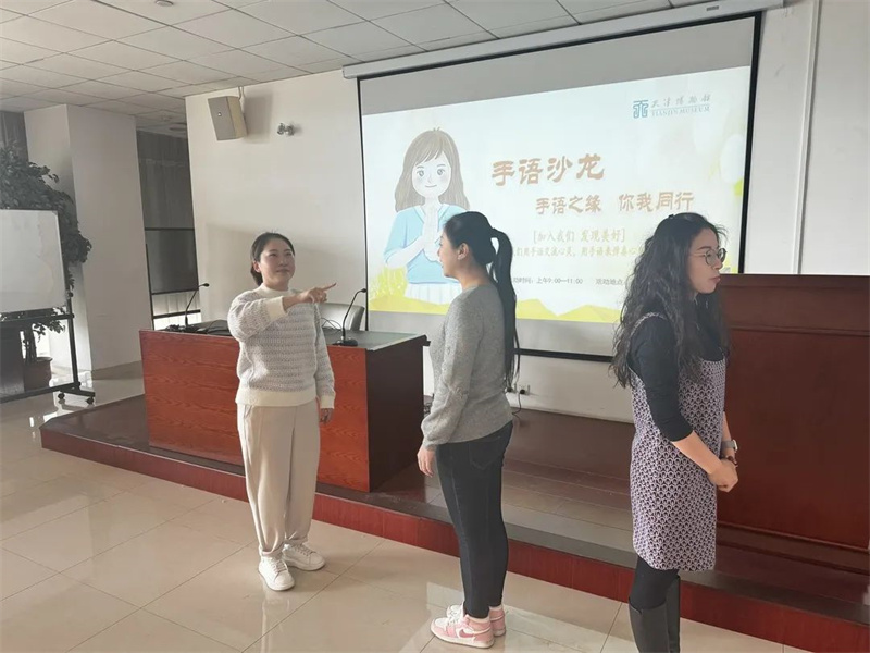 天津博物馆坚持以人民为中心的发展思想,不断增强民生福祉,推进本市无障碍博物馆建设,加强手语导览志愿服务工作,提高手语技能、视觉辨识能力以及多方位的交流能力,为听障人士提供更精细的文化服务,图像信息部特别策划了以“手语之缘,你我同行”为主题的系列“手语沙龙”活动。11月27日上午9时在天博举行首场活动,共有8位文旅系统志愿者参加。