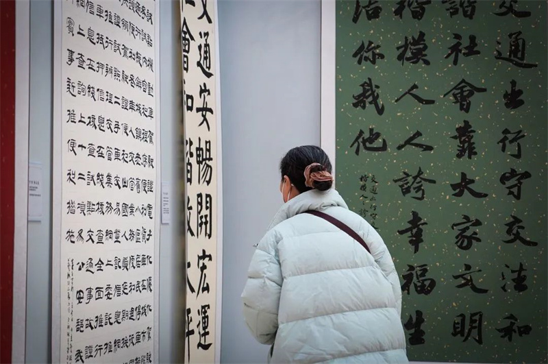 “这是行书,那边几幅是隶属、草书,还有油画、国画、剪纸,这些作品都是在告诉大家在出行中要自觉文明、守法,这个展览的创意真棒。”作为一名书法爱好者,市民张先生仔细参观了每一件展出作品,并表示深受启发:“今天在这里收获很多,不但参观到了很多名家作品,也深切感受到了文明交通氛围,我也要写几幅文明交通主题对联,过年时自己贴、送亲友!”