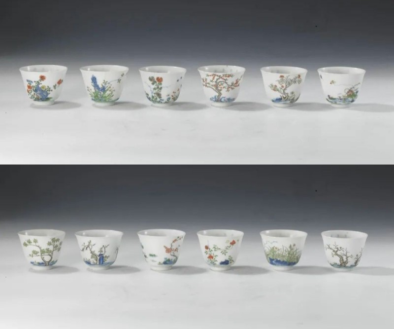 天津博物馆藏康熙款五彩十二月花神诗文杯,一组12件,按月绘制相应花神,青花楷书对应诗文。花神杯胎薄透光,莹泽细腻;纹饰色彩鲜丽清新,绘制生动自然,是康熙五彩瓷器的精品。