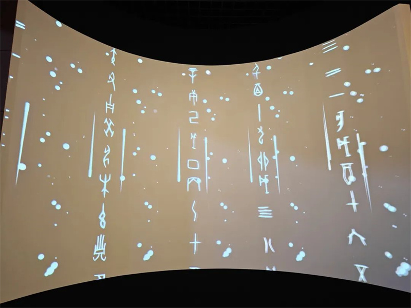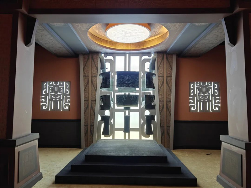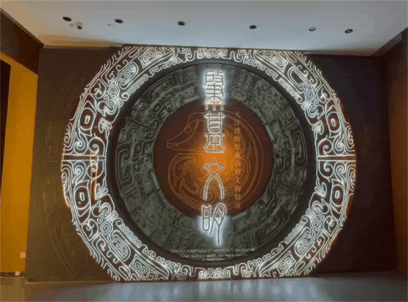 展览的设计风格古朴而大气,以“时间·时空·永恒·碎片”为主题,在充分体现馆藏特色和商周文明核心特质的同时,利用实物、文字、图像、视频、游戏等多种展示方式,提高展览的互动性和趣味性。以场景搭建的方式,巧妙地融入了解构主义与时间碎片的概念,选择蕉叶纹鼎解构对象,让观众在参观过程众感受到时间与空间的转换,永恒与时间的流逝,历史的变迁与演变。以甲骨文和现代文字为主题,设计了反转牌墙,让观众在观赏过程中感受到古今文字的碰撞和交融,了解汉字的演变过程,提高文化素养,增强民族自豪感。