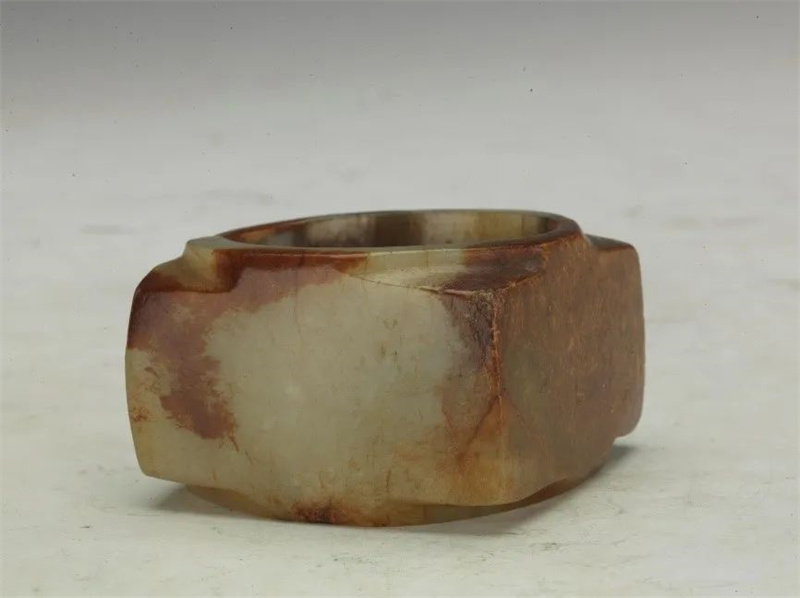 白玉,质地温润,多有黄褐色沁。呈扁方柱体,内圆外方,体薄空大。通体光素无纹,虽杂以沁色,但极富绚丽之美。西周白色玉琮少见。