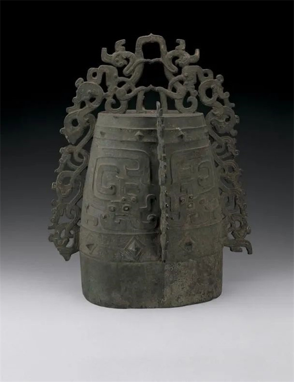 克镈呈椭圆体,平口,四面有透雕夔纹凸棱装饰,体腔饰浮雕龙纹,有两道锥形乳钉带,鼓部有铭文。