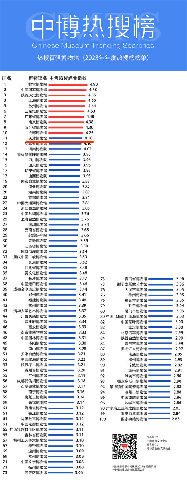 近日,由中国文物交流中心指导,“中博热搜榜”发布2023年度全国热门博物馆百强榜单,天津博物馆年度排名第11位,相比2022年度排名上升了23位,创造历史新高。