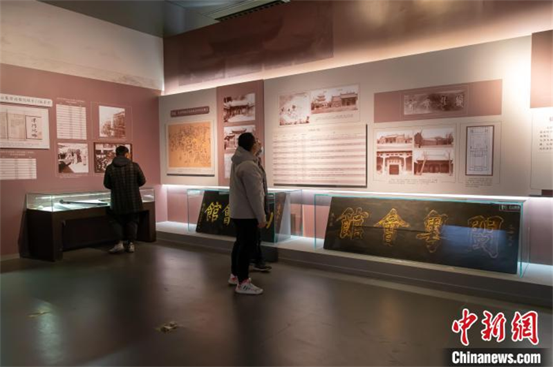 漕运的发展形成天津三岔河口繁荣的商业景象。图为游客正在参观京杭大运河天津段附近的餐饮、商会相关展品。