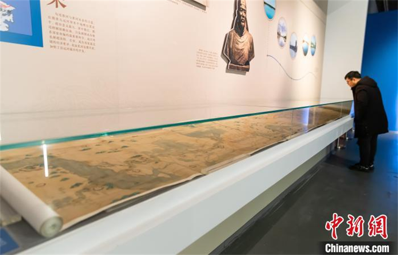 近日,国家一级文物清乾隆时期《漕运图卷》亮相天津博物馆。图为游客正在参观该展品。