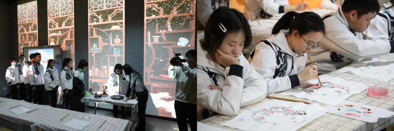 课程分为“讲解观展”、“文化体验”两个部分。由天博社教老师引领同学们进入展厅,介绍藏品及背后的故事,唤起同学们对传统文化的热爱,对话历史,对话文化。之后在展厅组织学生参与杨柳青木板年画的拓印与绘制过程。学生在创作中将理论知识与动手实践相结合,获得了不一样的博物馆学习体验。
