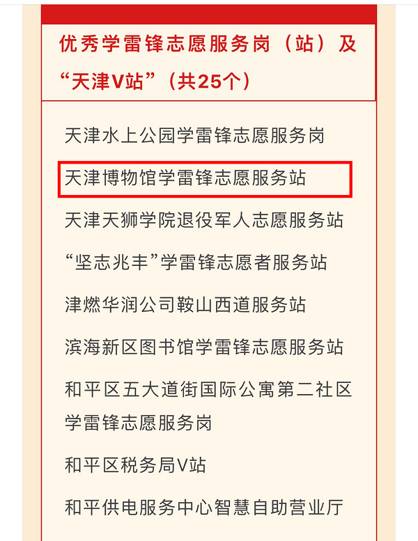 市级奖项1个。天津博物馆学雷锋志愿服务站在市委宣传部、市文明办等21个部门联合组织开展的2023年度天津市学雷锋志愿服务“六个一批”先进典型宣传推选活动中荣获“天津市优秀学雷锋志愿服务(站)”荣誉称号。
