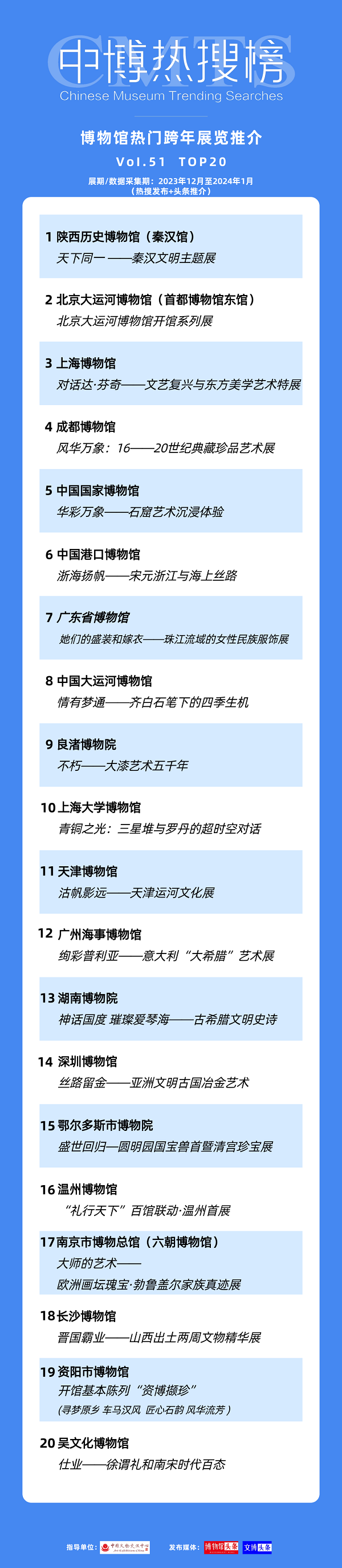 由中国文物交流中心指导、博物馆头条发布的中博热搜榜今日发布最新一期热门展览榜单(Vol.51),本次发布的二十大展览为全国各大博物馆2023年12月推出的展览,均为跨年新展特展。天津博物馆“沽帆影远——天津运河文化展”上榜。