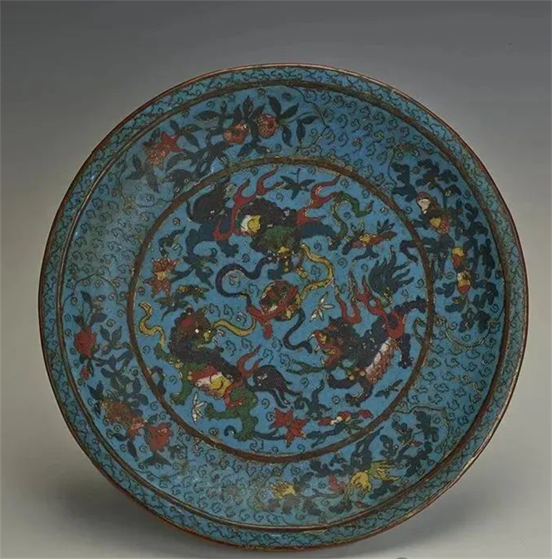 明掐丝珐琅麒麟戏绣球纹盘
