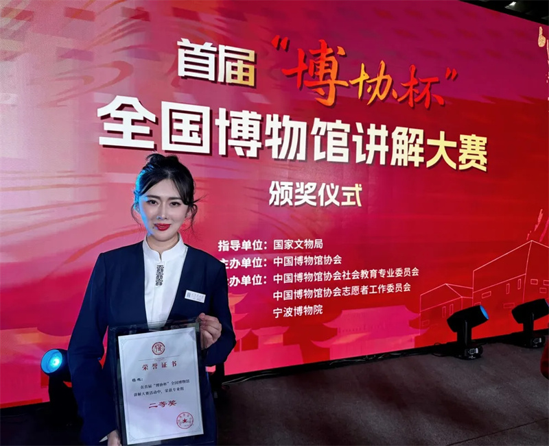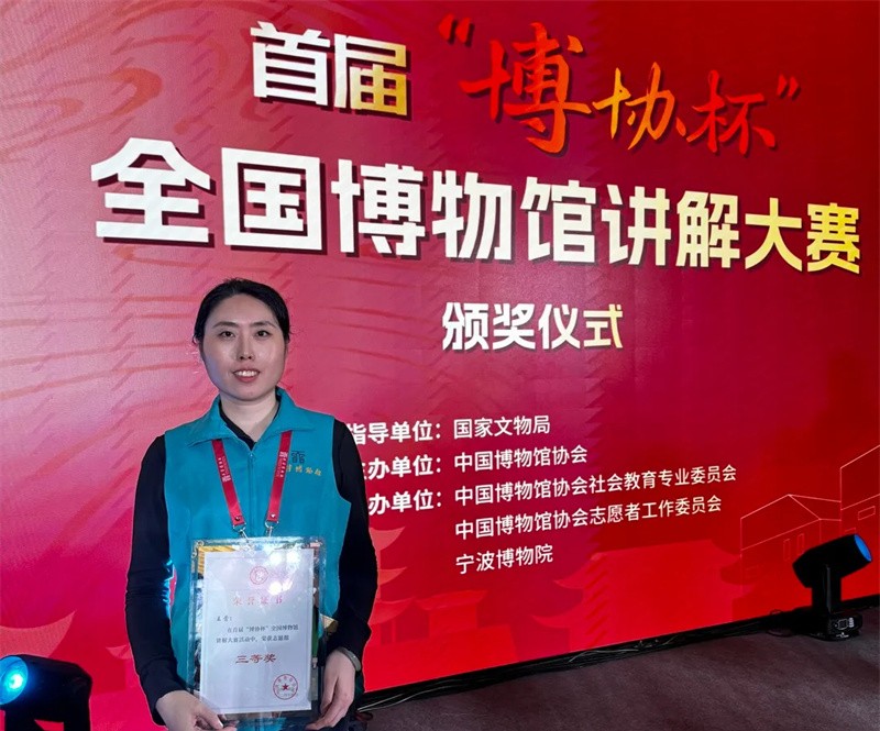 4月1日,由国家文物局指导,中国博物馆协会主办的首届“博协杯”全国博物馆讲解大赛决赛在宁波举办。来自全国各地博物馆的50名专业组选手、50名志愿组选手齐聚一堂,共同竞技交流,提升专业技能。经过紧张的激烈角逐,我馆讲解员杨旭获专业组二等奖,志愿者王莺获志愿组三等奖。