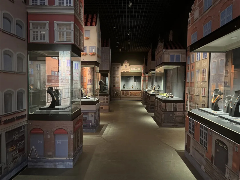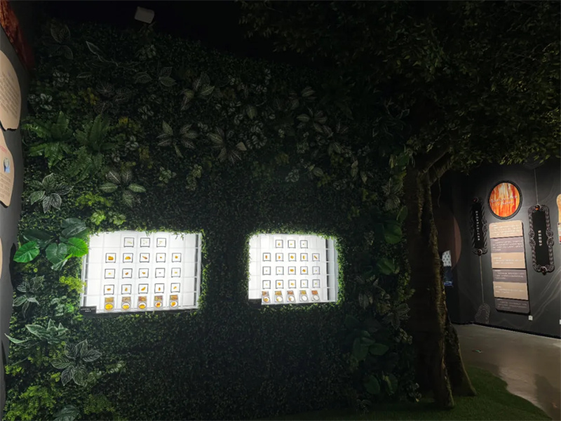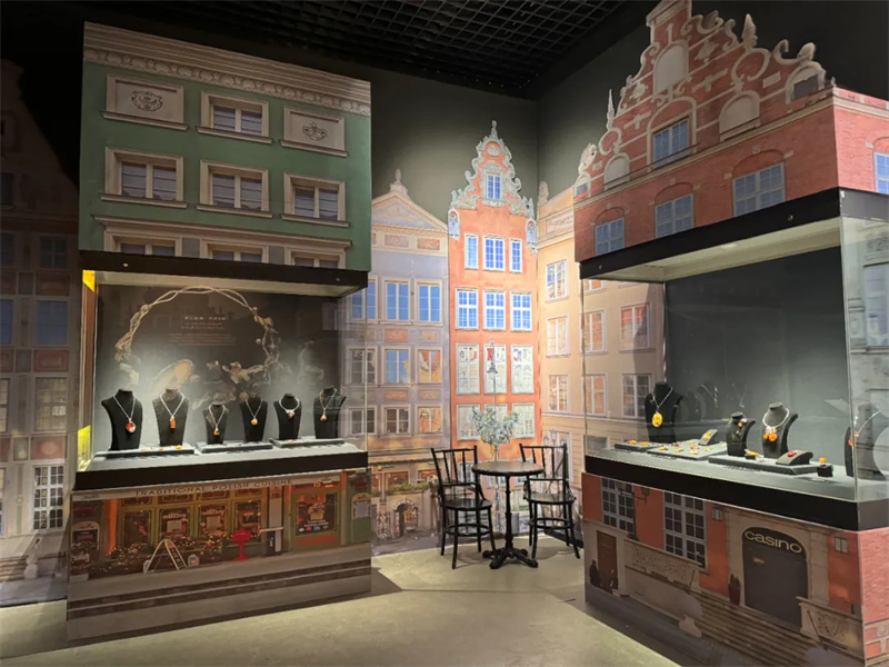 展览设计形式多样,科技与艺术相融合,为观众提供多元化观展体验。设计团队精心打造了“森林琥珀墙”和“格但斯克琥珀街”两处艺术场景,使观众能够更通透直观地欣赏琥珀的细节之美。LED五面立体式包围屏幕也是展览中的一大亮点,多媒体视频生动还原了一块琥珀从形成,到被打捞后制作成珠宝首饰的动态演变过程,构建了一个极具艺术表现力的虚拟空间,期待能够带给观众以触碰心灵的感官体验。