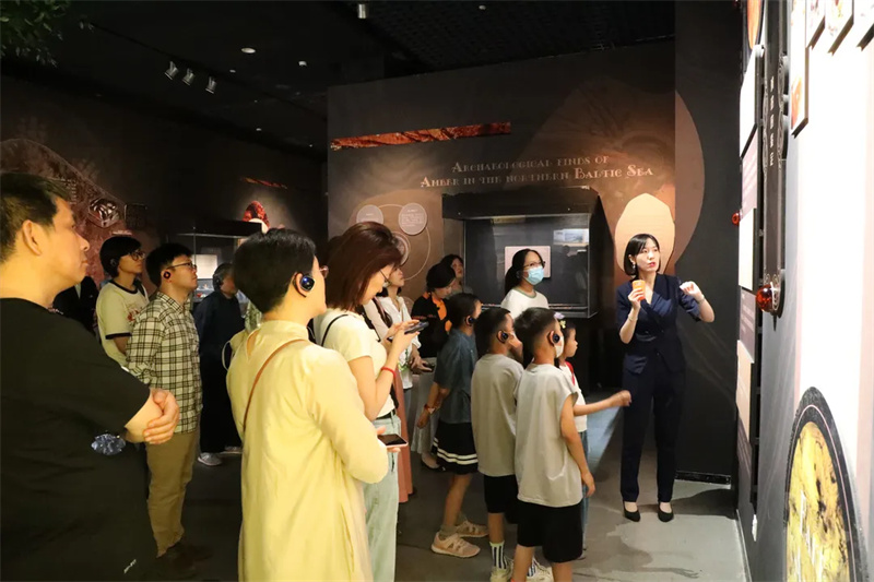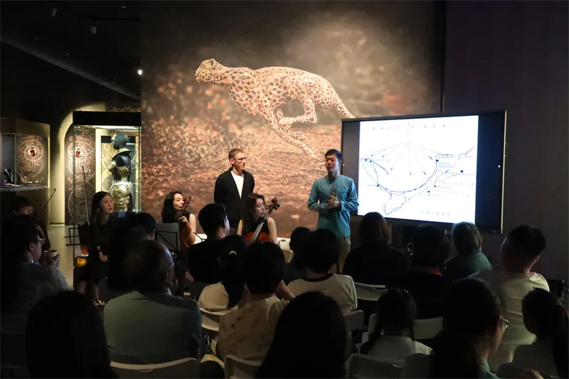 在讲解员的带领下,观众们走进“瞬间与永恒——波兰琥珀文化艺术展”欣赏各类琥珀珍品,探索神秘的琥珀世界。随后,来自果子室内乐团的音乐家们,现场演奏了观众们耳熟能详的《蓝色多瑙河》、《波兰舞曲》、《巴赫小步舞曲》等经典曲目。伴随优美的旋律,中波双方策展人以展览中的琥珀原石为导览赏析切入点,讲述石器时代以来,人类对琥珀的发现及应用,以及近现代波兰艺术家是如何将琥珀与不同材质相结合,形成精美的琥珀珠宝藏品及艺术品,让观众进一步了解琥珀展品的“前世今生”,感受不同地域、不同时代的文化魅力。