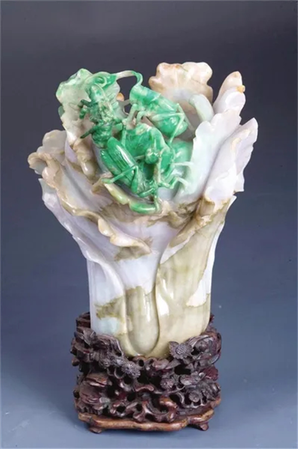 这件展品是用翡翠雕刻成白菜,上面立着两只蝈蝈和一只螳螂,形象生动。制作者技艺高超,设计精妙,把最好的绿色都集中表现在三只昆虫上,被称之为“巧雕”。制作者又通过巧妙的设计,使得原石的绺裂出现在器物后面,构思之精,令人感叹。而当下的科学家,通过现代农业科学技术的应用,使新品种的白菜可以实现无土培植。这件清代的文物跟几百年后的科技创新相呼应。
