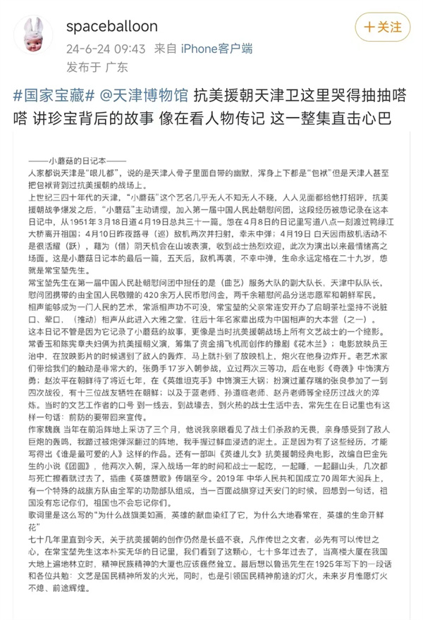 然而等到节目播出时,“小蘑菇日记本”的故事瞬间就感动了千万人,大家纷纷留言表示“看哭了”:“因为这件文物前世今生的故事让大家感受到了革命烈士无私奉献的精神”“要和亿万同胞一起致敬最可爱的人,祝福我们伟大的祖国”……有很多观众特意来到博物馆,想一睹常宝堃先生的日记本,了解先辈的英雄事迹。