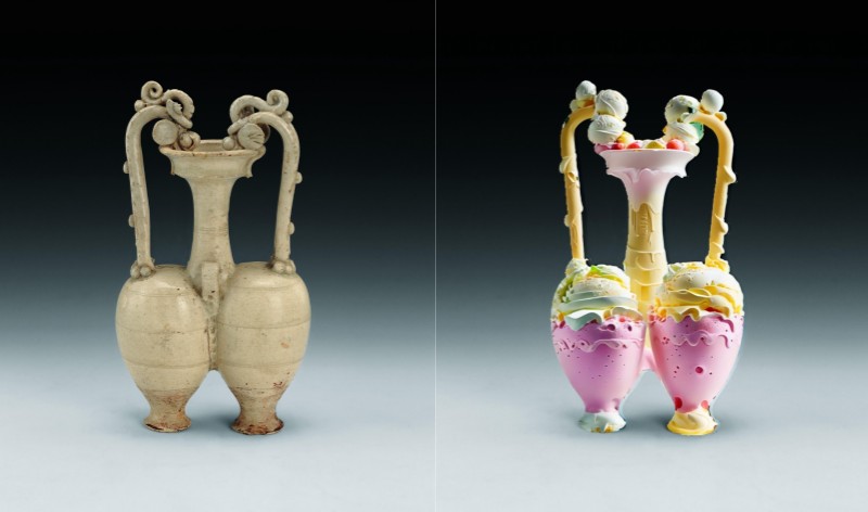此瓶盘口,单颈,双腹相连,连接处有两个环形系。肩左右两侧各塑一条修长的龙形柄,龙头探入瓶口内,似在贪婪地吸吮着瓶中的玉液琼浆。双龙柄为手工捏塑而成,手法简单干练,形象生动逼真。双平底刻有铭文:“此传瓶,有並”。由此得知,此瓶名称应为传瓶”。“有並”又作何解?可以理解为此瓶瓶身双腹相连,也可理解为此瓶成双。这件传瓶,造型新颖别致,既具北朝和隋代瓷器所特有的浑厚凝重,又不乏灵秀活泼,其线条刚柔相济,是隋代创新的器型,代表了当时白瓷制作的最高工艺水平,成为隋代稀有的瓷酒器精品。