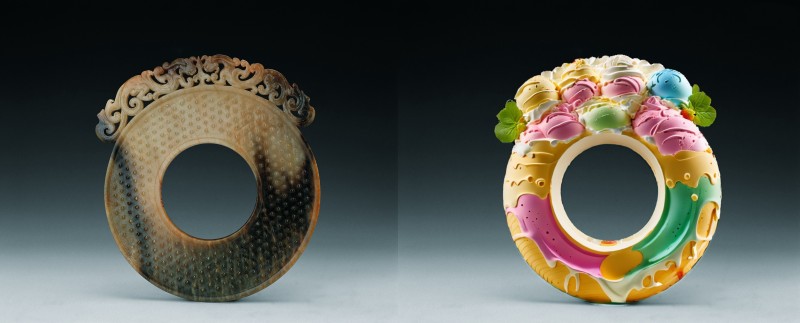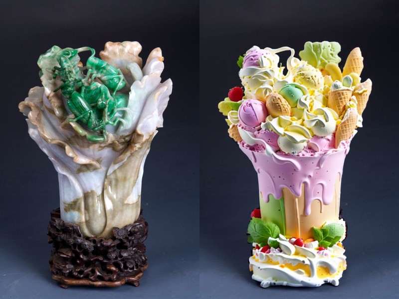 该器高19.4厘米,重2公斤余。其下部分材质灰白色相间,并伴有褐色斑,工匠将其琢成菜帮,帮叶翻卷,叶脉分明。作者利用菜心处材质的翠绿色,圆雕一对大腹蝈蝈和一只螳螂,它们好象在边爬边啃菜叶。这件翡翠蝈蝈白菜堪称巧作中的上品,匠师量材施技,据色拟形。褐色的菜帮,似乎是因存放不当而伤,但却达到更贴近实际的意外效果。绿叶上的两只蝈蝈、一只螳螂,正心无旁骛地专注咀嚼着美味,形象鲜活逼俏,妙趣横生。白菜寓意百财,蝈蝈寓意子嗣繁多。在这件作品上,蔬菜和草虫的生命活力,表现得淋漓尽致,加之吉祥的内涵,令观者由然而生一股昵爱情愫。作者的巧思妙构及卓越技艺,堪称冠绝。