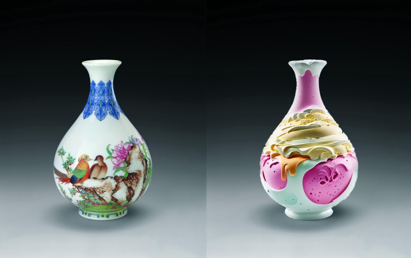 高16.3厘米,口径4厘米,底径5厘米。小撇口,长颈,腹部下端丰满,圈足。瓶胎质细腻洁白,胎体轻薄,釉面莹润如玉,上用珐琅彩绘画。颈部用蓝料彩绘上下两组蕉叶纹,腹部珐琅彩绘芍药雉鸡图:两只雌雄雉鸡栖身于山石上,彼此相偎,作态亲昵,周围衬以芍药花及秋季花草。空白处墨彩题诗:“青扶承露蕊,红妥出阑枝。”引首朱文“春和”印,句尾白文“翠铺”朱文“霞映”二方印。瓶底赭彩四字方款“乾隆年制”。这件玉壶春瓶,构图十分精美,芍药雉鸡寓意金鸡富贵,有吉祥的含义。画工精细入微,绘画图案取自清代宫廷画家的手稿。此瓶集诗、书、画、印于一身,有如一幅展开的画卷,称之国宝名副其实。