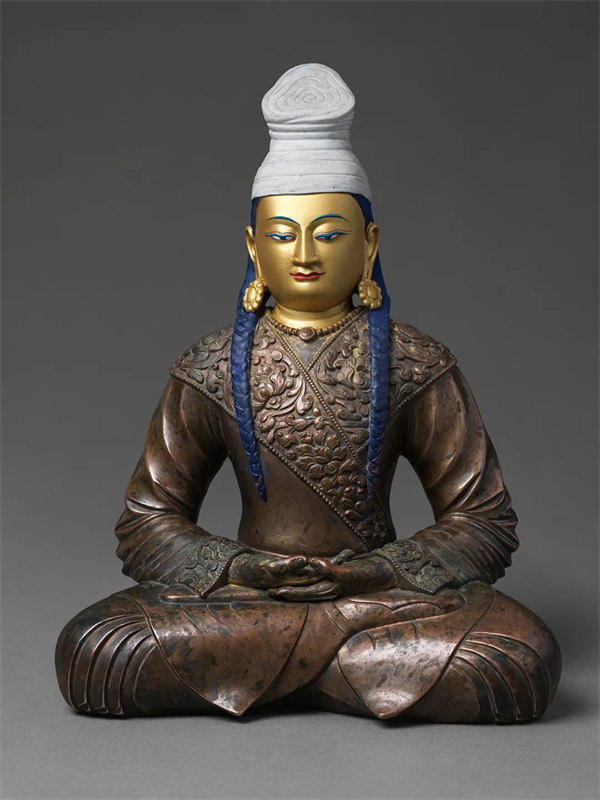 松赞干布像,头戴白色“拉堆帽”,面目清秀,着三角大翻领袍,长袍束腰,饰耳环项链,两条发辫披肩而下,双手于腹前结禅定印,结全跏趺。“雪域雄主”松赞干布是吐蕃地方政权第32任赞普,吐蕃王朝立朝之君,为开发隋唐时期的中国西南边疆,促进古代西藏地区的制度建设、经济发展和文化繁荣作出了不可磨灭的贡献。