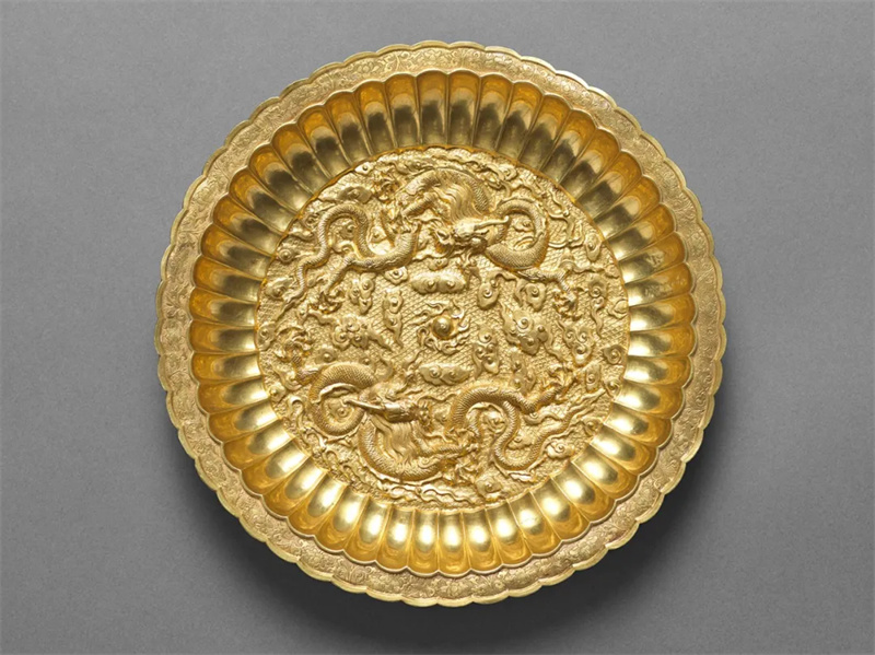 双龙戏珠菊瓣金盘